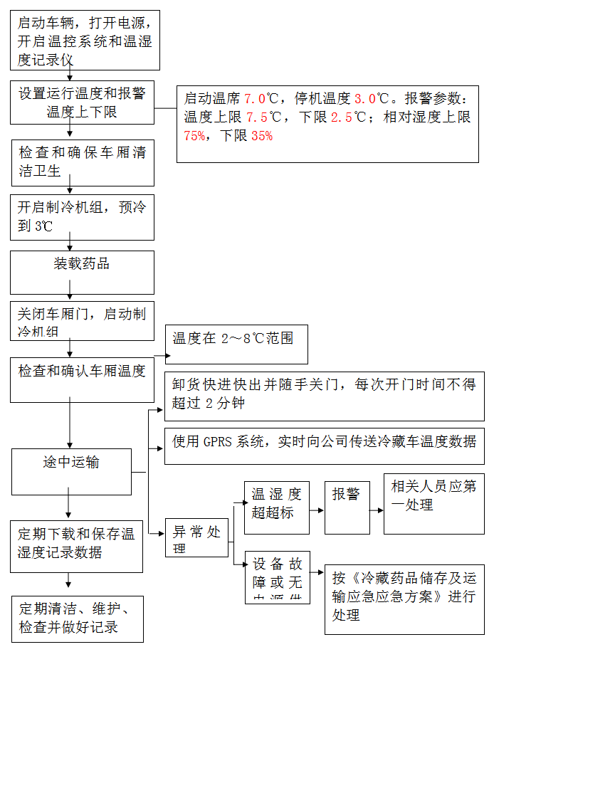 2、運輸冷藏藥品時,應(yīng)事先發(fā)出運行通知,標明運行方式、線路、運輸人員、異常情況處理方案等事項。